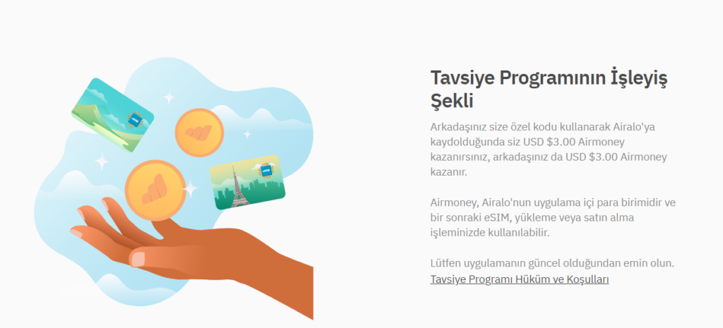 Airalo tavsiye programı kapmasında uygulamaya davet edeceğiniz her arkadaşınız için kendiniz ve arkadaşınız $3.00 kazanır. Kampanya üst sınırı yoktur. Airalo tavsiye programından faydalanmak için profilinize girin “Tavsiye Edin ve Kazanın” bölümüne tıklayın size özel tavsiye kodunuzu alın. Tavsiye kodunuzu arkadaşlarınızla veya sosyal medyadan paylaşın. Tavsiye kodunuz ile üye olduklarında ve ilk e-Sim alım işlemeni gerçekleştirdiklerinde siz de $3.00 Airmoney kredisi kazanırsınız.