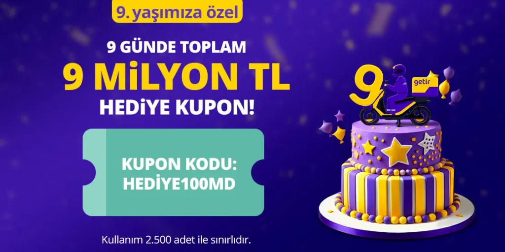 Getir 9. Yıl Kampanyası İndirim Kodu – 6 Ağustos’a Özel 100 TL İndirim