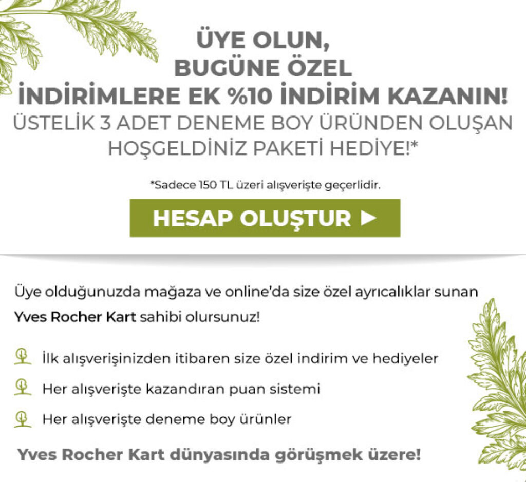 Yves Rocher yeni üyelere özel tüm indirimlere ek %10 indirim kodu sağlayan bir kampanya fırsatı sunuyor. İndirim kampanyasından faydalanmak için Yves Rocher’e ilk defa üye olmanız ve 150 TL üzeri sipariş vermeniz gerekmektedir. Kampanya kapsamında vereceğiniz siparişlere 3 adet deneme boy ürün de hediye edilecektir.